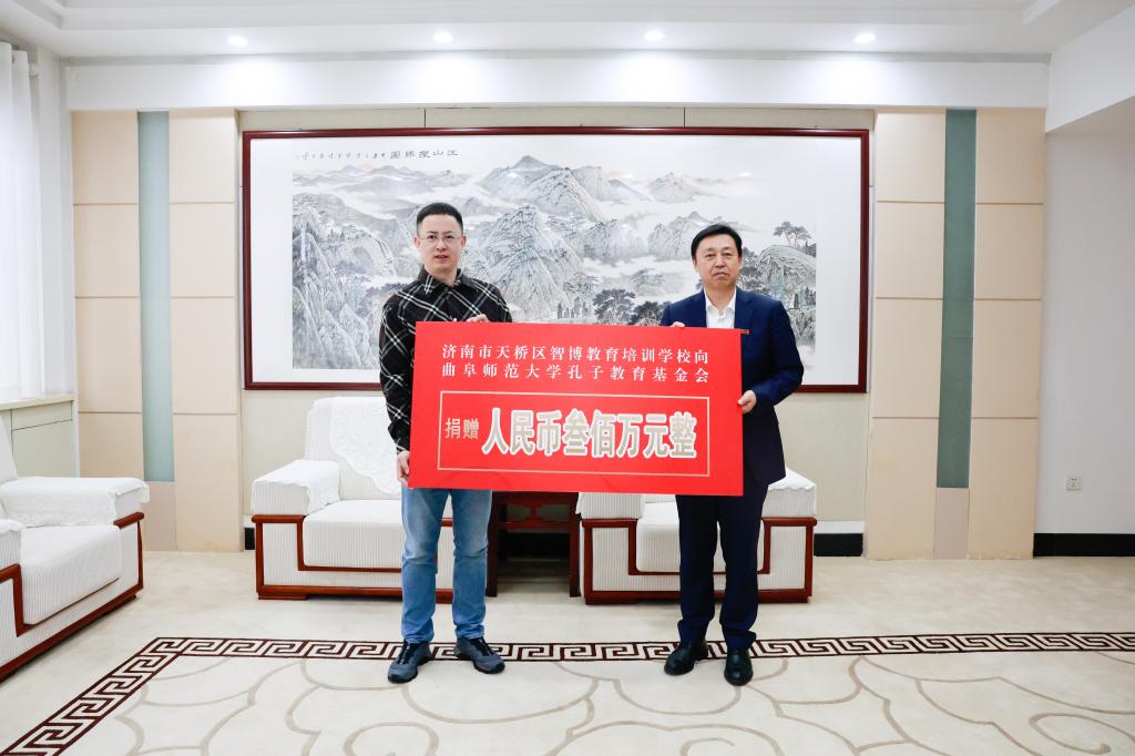 国内合作处讯 10月17日,曲阜师大2003级体育教育专业校友山东智博教育投资集团创始人兼董事长、校长王光修重返母校,向学校捐赠300万元人民币,献礼学校建校70周年。学校党委副书记、校长张洪海会见并颁发捐赠证书