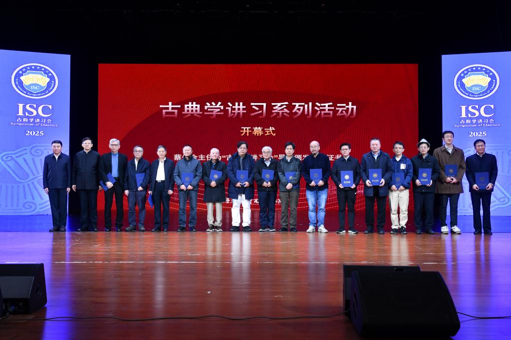 邢光与蔡先金共同为“国际古典学讲习会”揭牌,蔡先金为“古典学讲习会”导师颁发会士证书。