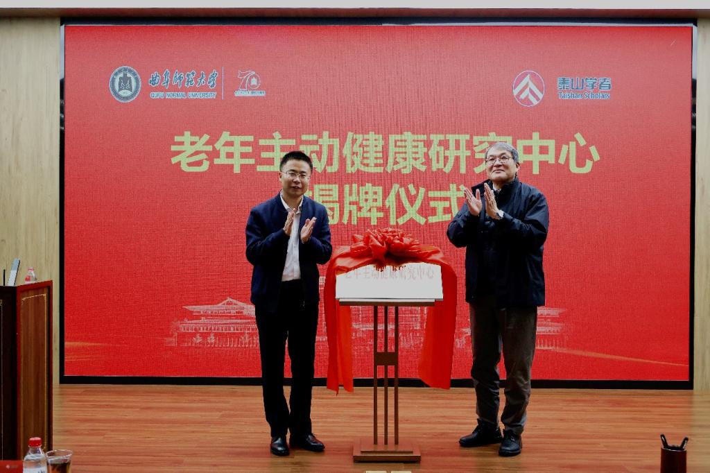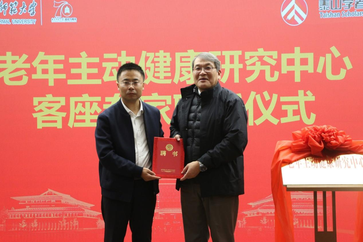 李登旺与陈佩杰共同为"LD平台_LD(中国)一站式服务官网老年主动健康研究中心"揭牌,李登旺为与会专家颁发客座教授聘书。