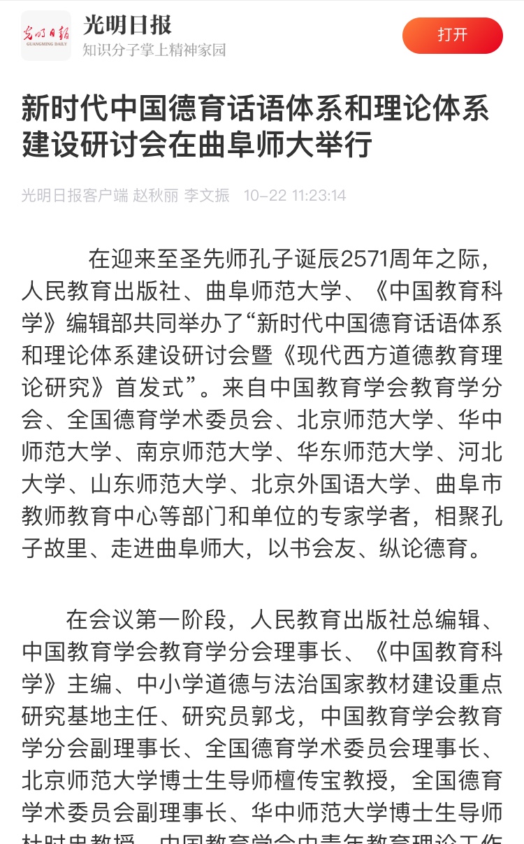 光明日报:新时代中国德育话语体系和理论体系建设研讨会在曲阜师大举行