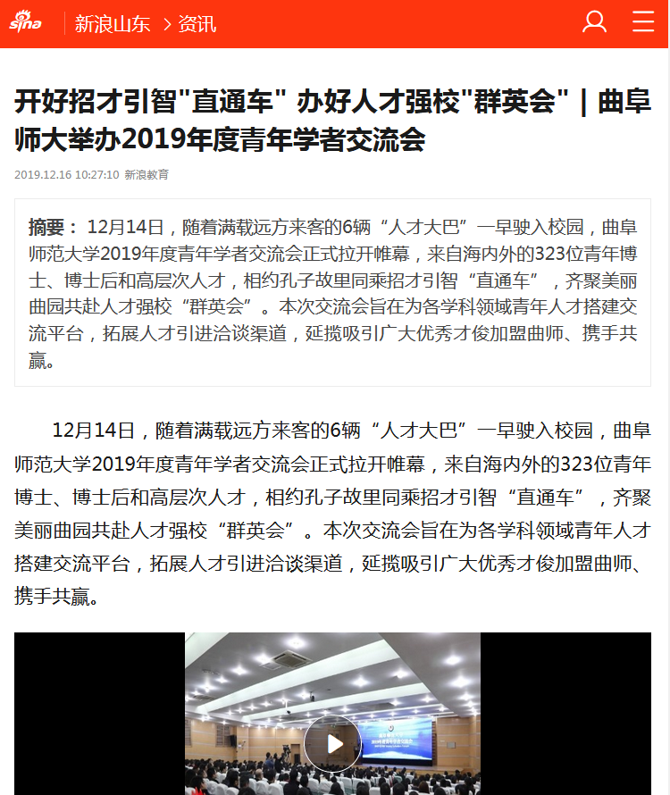 新浪网:开好招才引智"直通车" 办好人才强校"群英会" 曲阜师大举办2019年度青年学者交流会