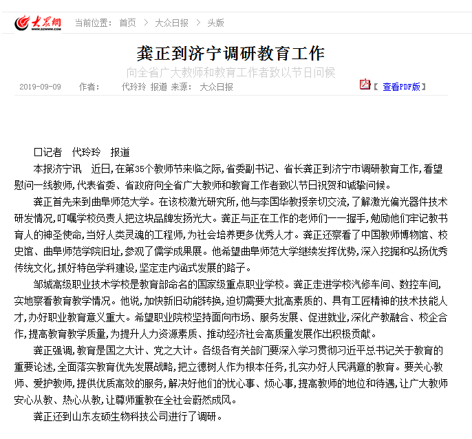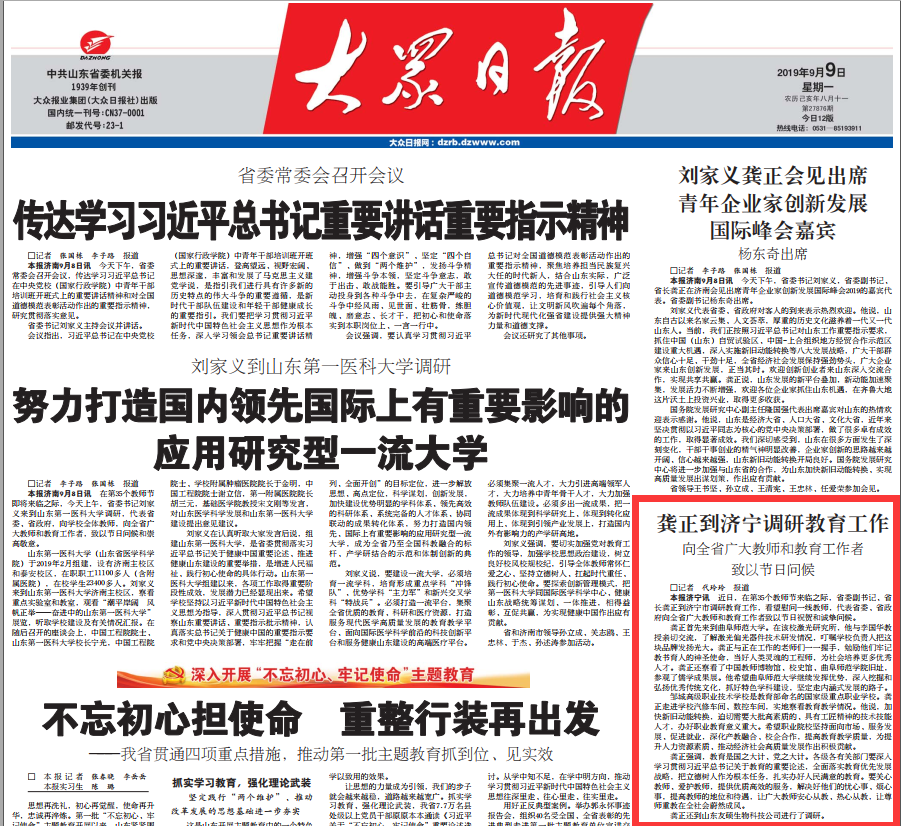 大众日报:省委副书记、省长龚正到曲阜师大调研教育工作