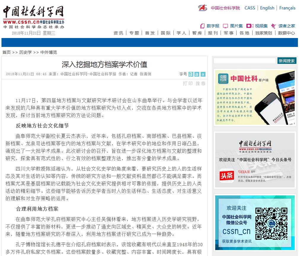 中国社会科学报:第四届地方档案与文献研究学术研讨会在曲阜举行