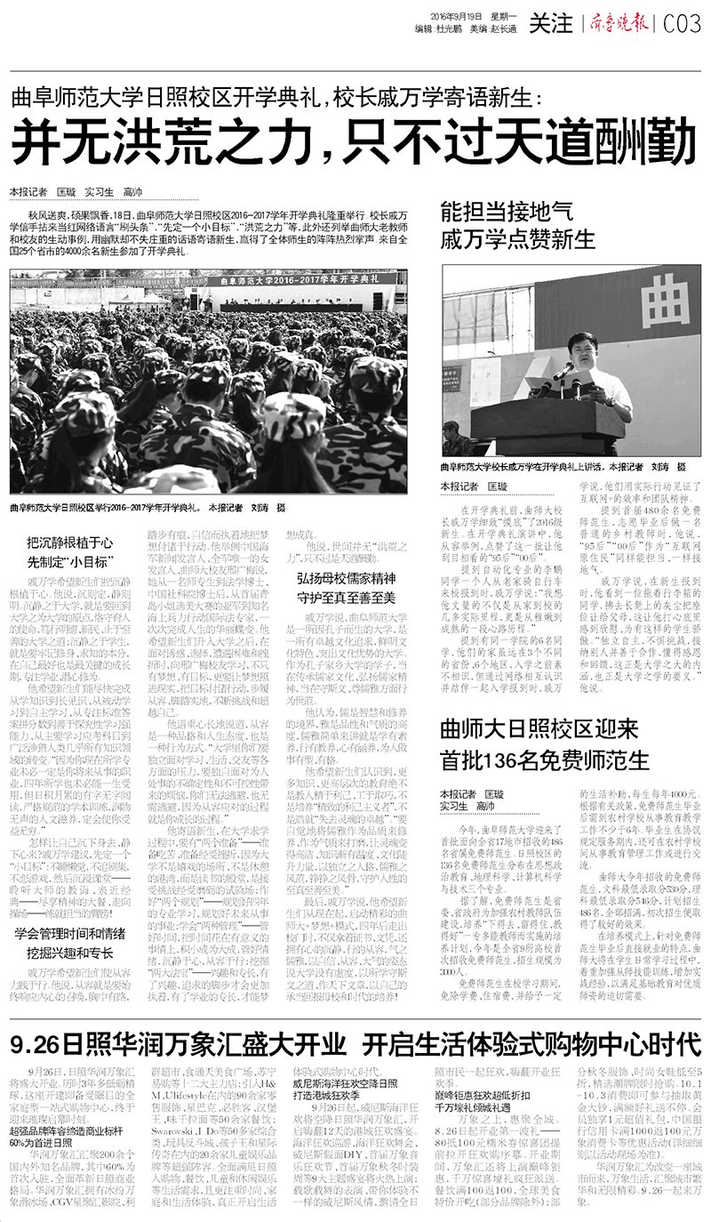 齐鲁晚报:LD平台_LD(中国)一站式服务官网开学典礼 校长戚万学寄语新生