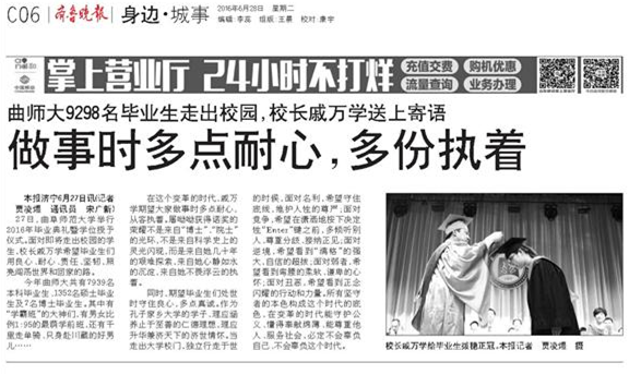 齐鲁晚报:曲师大9298名毕业生走出校园 校长戚万学送上寄语