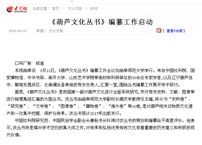 《大众日报》:《葫芦文化丛书》编纂工作启动