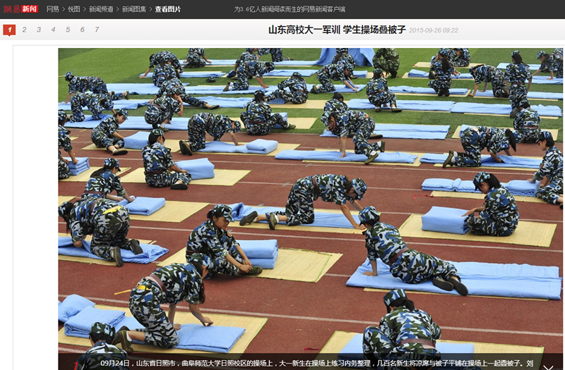 网易新闻:山东高校大一军训 学生操场叠被子