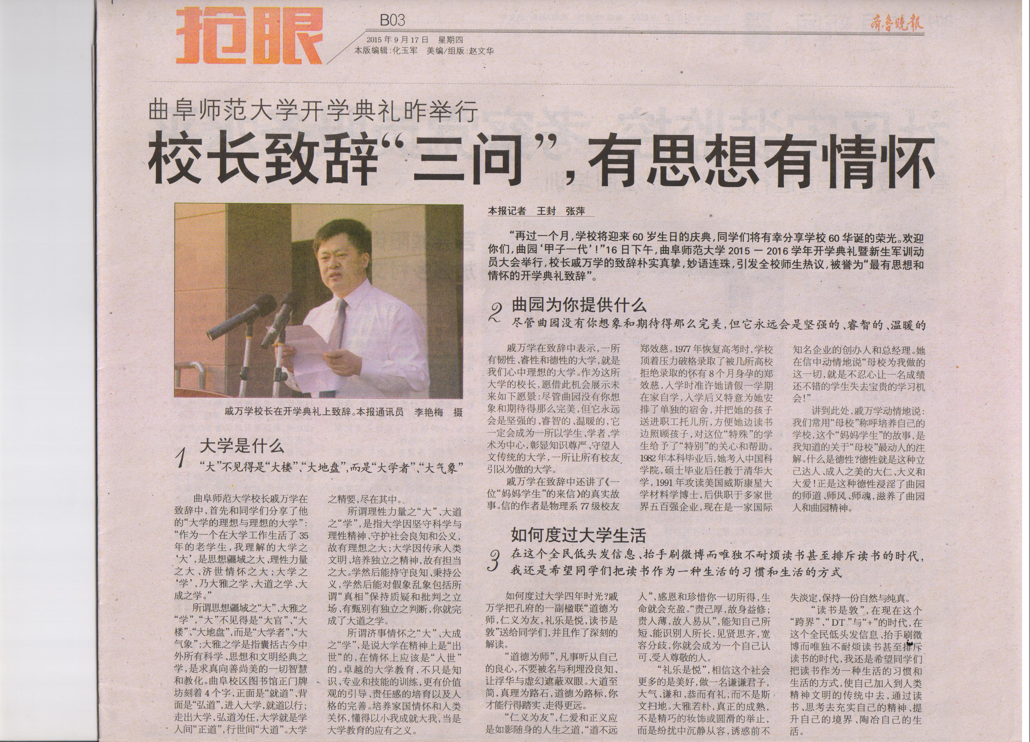 齐鲁晚报:LD平台_LD(中国)一站式服务官网开学典礼,戚万学校长致辞“三问”,有思想有情怀