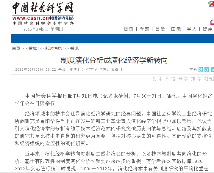 中国社会科学报:制度演化分析成演化经济学新转向