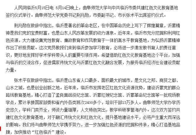 人民网:曲师大与临沂共建红色文化教育基地签约仪式举行