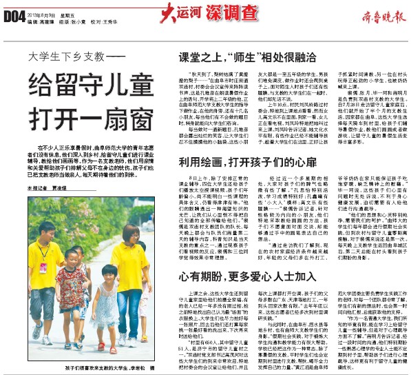 齐鲁晚报:大学生下乡支教——给留守儿童打开一扇窗