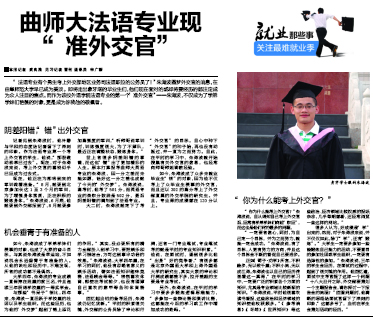 6月5日,《济宁晚报》刊发通讯《曲师大法语专业现准“外交官”》,报道了我校外国语学院应届毕业生朱海波,以优异成绩考取外交部公务员的消息。