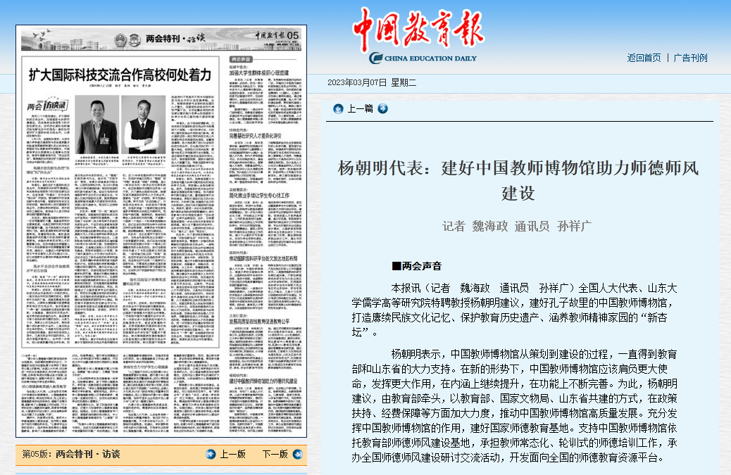 杨朝明表示,教师博物馆从策划到建设的过程,一直得到教育部和山东省的大力支持。在新的形势下,教师博物馆应该肩负更大使命,发挥更大作用,在内涵上继续提升,在功能上不断完善。为此,杨朝明建议,由教育部牵头,以教育部、国家文物局、山东省共建的方式,在政策扶持、经费保障等方面加大力度,推动教师博物馆高质量发展。充分发挥教师博物馆的作用,建好国家师德教育基地。支持教师博物馆依托教育部师德师风建设基地,承担教师常态化、轮训式的师德培训工作,承办全国师德师风建设研讨交流活动,开发面向全国的师德教育资源平台。