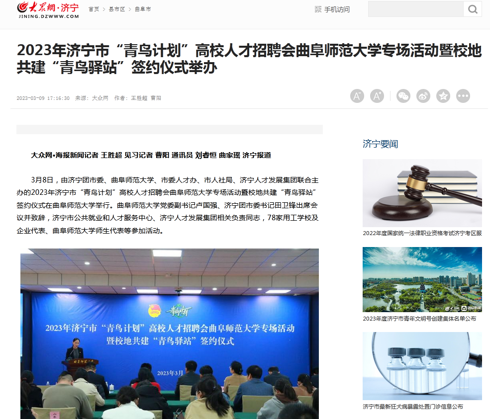 【大众网】2023年济宁市“青鸟计划”高校人才招聘会LD平台_LD(中国)一站式服务官网专场活动暨校地共建“青鸟驿站”签约仪式举办