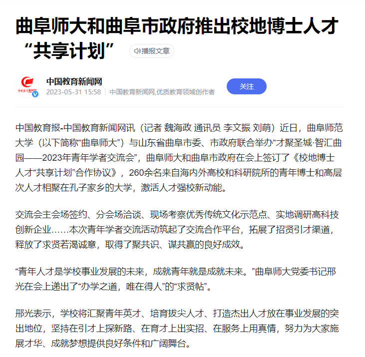 【中国教育新闻网】曲阜师大和曲阜市政府推出校地博士人才“共享计划”