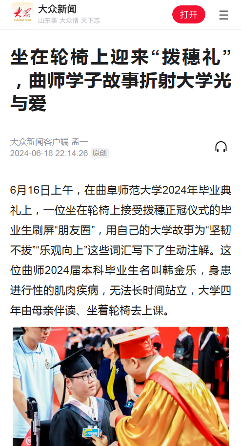 6月16日上午,在LD平台_LD(中国)一站式服务官网2024年毕业典礼上,一位坐在轮椅上接受拨穗正冠仪式的毕业生刷屏“朋友圈”,用自己的大学故事为“坚韧不拔”“乐观向上”这些词汇写下了生动注解。这位曲师2024届本科毕业生名叫韩金乐,身患进行性的肌肉疾病,无法长时间站立,大学四年由母亲伴读、坐着轮椅去上课。