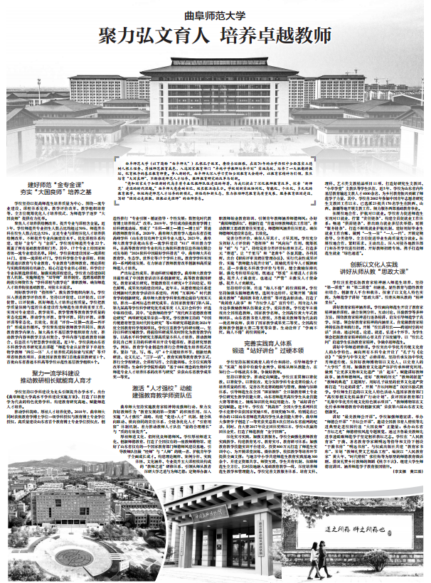 “党和国家关于加强新时代高素质专业化教师队伍建设的部署,为我们提出了深化教师教育改革、探索‘新师范’建设的时代课题。”曲阜师大党委副书记、校长张洪海表示。学校创新实施协同化、智能化、个性化、多元化的教育教学,积极构建师范人才培养的新模式、新格局和新生态,聚力推动师范教育高质量发展,服务教育强国建设,写好“强国必先强教,强教必先强师”的曲师答卷。