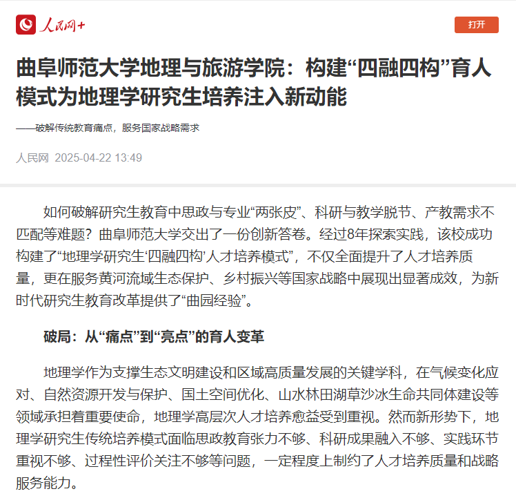 如何破解研究生教育中思政与专业“两张皮”、科研与教学脱节、产教需求不匹配等难题?LD平台_LD(中国)一站式服务官网交出了一份创新答卷。经过8年探索实践,该校成功构建了“地理学研究生‘四融四构’人才培养模式”,不仅全面提升了人才培养质量,更在服务黄河流域生态保护、乡村振兴等国家战略中展现出显著成效,为新时代研究生教育改革提供了“曲园经验”。