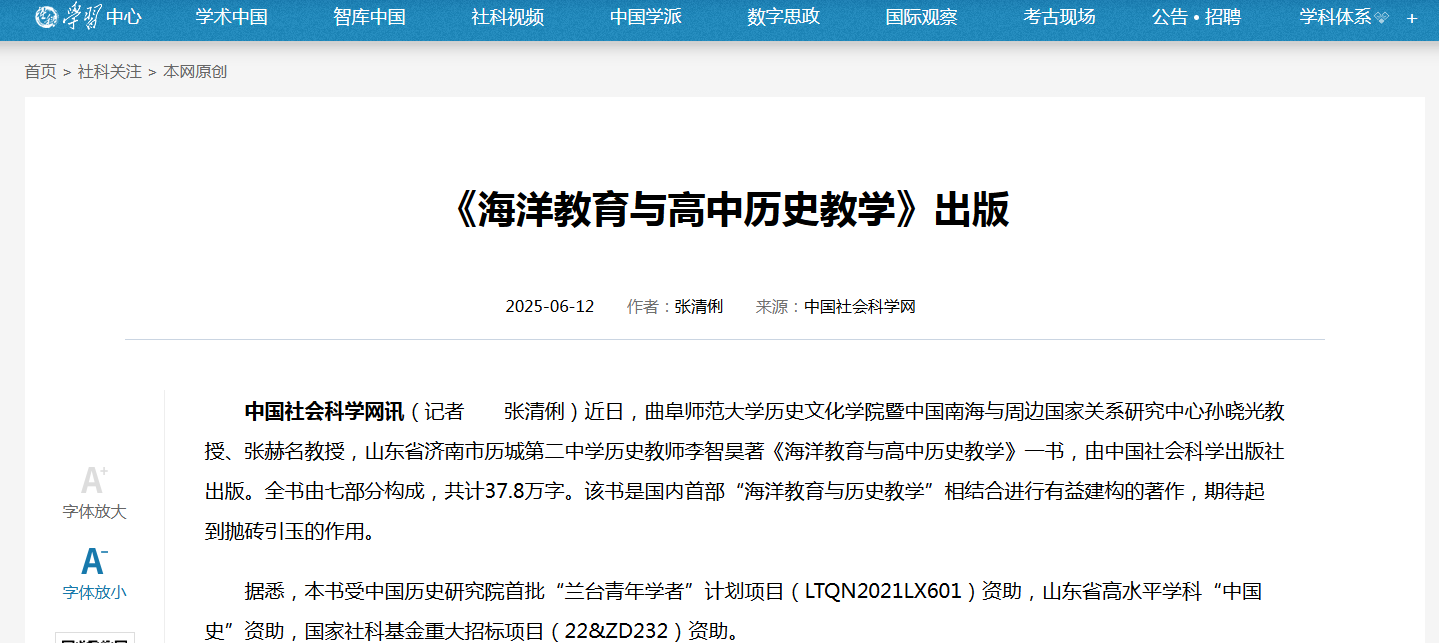 中国社会科学网讯(记者 张清俐)近日,LD平台_LD(中国)一站式服务官网历史文化学院暨中国南海与周边国家关系研究中心孙晓光教授、张赫名教授,山东省济南市历城第二中学历史教师李智昊著《海洋教育与高中历史教学》一书,由中国社会科学出版社出版。全书由七部分构成,共计37.8万字。该书是国内首部“海洋教育与历史教学”相结合进行有益建构的著作,期待起到抛砖引玉的作用。