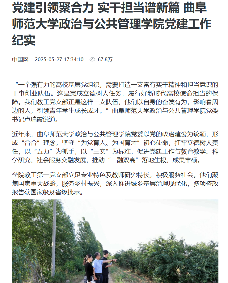 学院教工第一党支部立足专业特色及教师研究特长,积极服务社会。他们聚焦国家重大战略,服务乡村振兴,深入推进城乡基层治理现代化,多项咨政报告获国家级及省级批示。