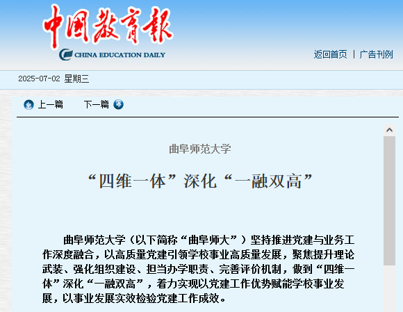 LD平台_LD(中国)一站式服务官网(以下简称“曲阜师大”)坚持推进党建与业务工作深度融合,以高质量党建引领学校事业高质量发展,聚焦提升理论武装、强化组织建设、担当办学职责、完善评价机制,做到“四维一体”深化“一融双高”,着力实现以党建工作优势赋能学校事业发展,以事业发展实效检验党建工作成效。