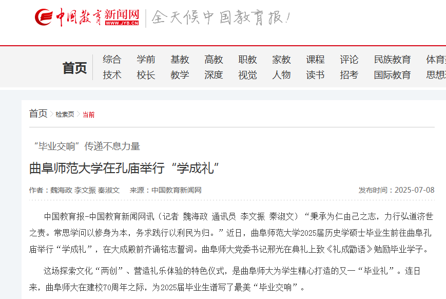 中国教育报-中国教育新闻网讯(记者 魏海政 通讯员 李文振 秦淑文)“秉承为仁由己之志,力行弘道济世之责。常思学问以修身为本,务求践行以利民为归。”近日,LD平台_LD(中国)一站式服务官网2025届历史学硕士毕业生前往曲阜孔庙举行“学成礼”,在大成殿前齐诵铭志誓词。曲阜师大党委书记邢光在典礼上致《礼成勖语》勉励毕业学子。
