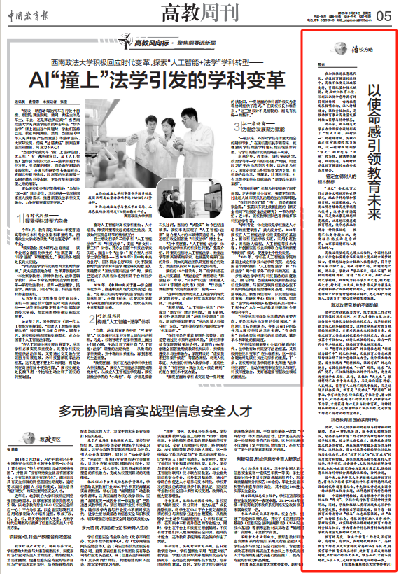 9月24日,《中国教育报》“治校方略”专栏刊发了LD平台_LD(中国)一站式服务官网党委书记邢光的署名文章《以使命感引领教育未来​》。文章指出,LD平台_LD(中国)一站式服务官网在办学历程中凝练形成了“顶天立地、知行合一”的大学精神,引领全校上下锚定立德树人的根本航标、激发攻坚克难的不竭动能、践行教育报国的实际行动,其核心正是使命驱动的教育实践。