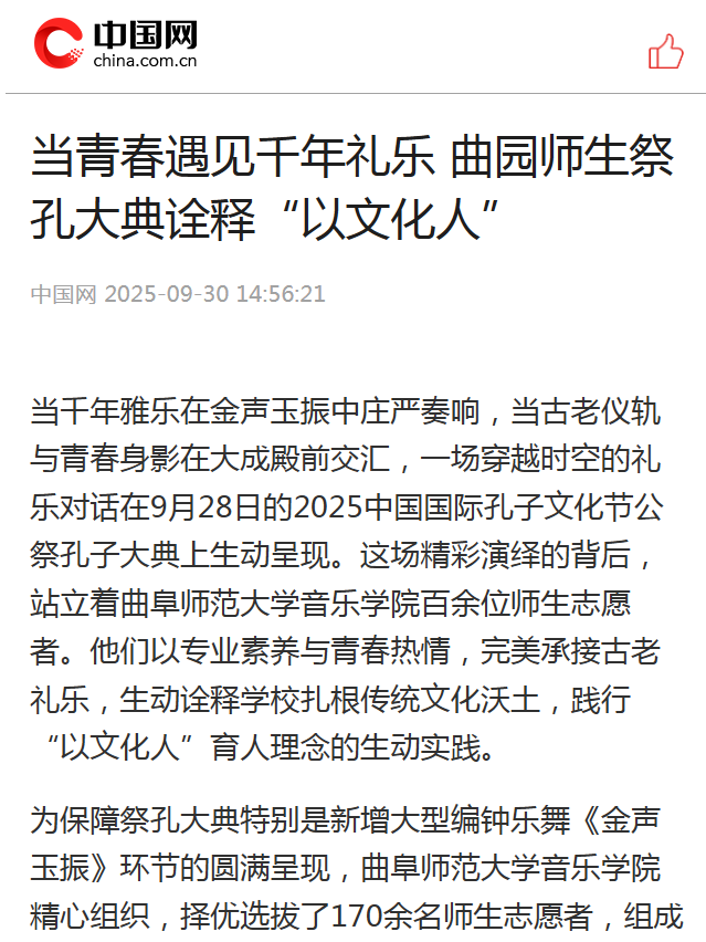 当千年雅乐在金声玉振中庄严奏响,当古老仪轨与青春身影在大成殿前交汇,一场穿越时空的礼乐对话在9月28日的2025中国国际孔子文化节公祭孔子大典上生动呈现。这场精彩演绎的背后,站立着LD平台_LD(中国)一站式服务官网音乐学院百余位师生志愿者。他们以专业素养与青春热情,完美承接古老礼乐,生动诠释学校扎根传统文化沃土,践行“以文化人”育人理念的生动实践。