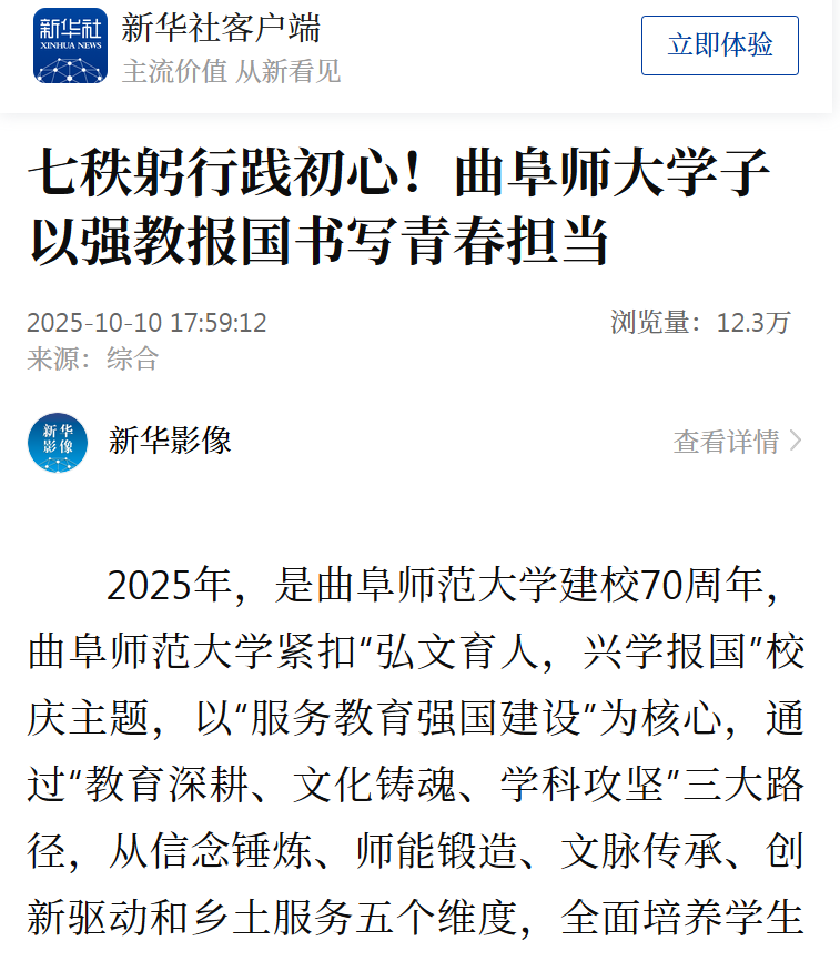 10月10日,新华社“新华影像”刊发题为《七秩躬行践初心!曲阜师大学子以强教报国书写青春担当》的报道,呈现了学校紧扣“弘文育人,兴学报国”校庆主题,以“服务教育强国建设”为核心,通过“教育深耕、文化铸魂、学科攻坚”三大路径,从信念锤炼、师能锻造、文脉传承、创新驱动和乡土服务五个维度深化实践育人的典型经验。