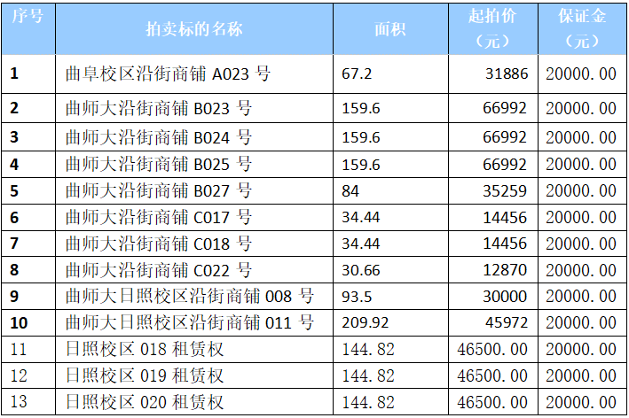 (paimai.caa123.org.cn)按现状公开拍卖以下标的:LD平台_LD(中国)一站式服务官网沿街房租赁权,门牌号为A023 \B023\B024\B025\B027\C017\ C018\C022 \日照校区008、011、018、019、020,共13套,每套竞买保证金2万元。