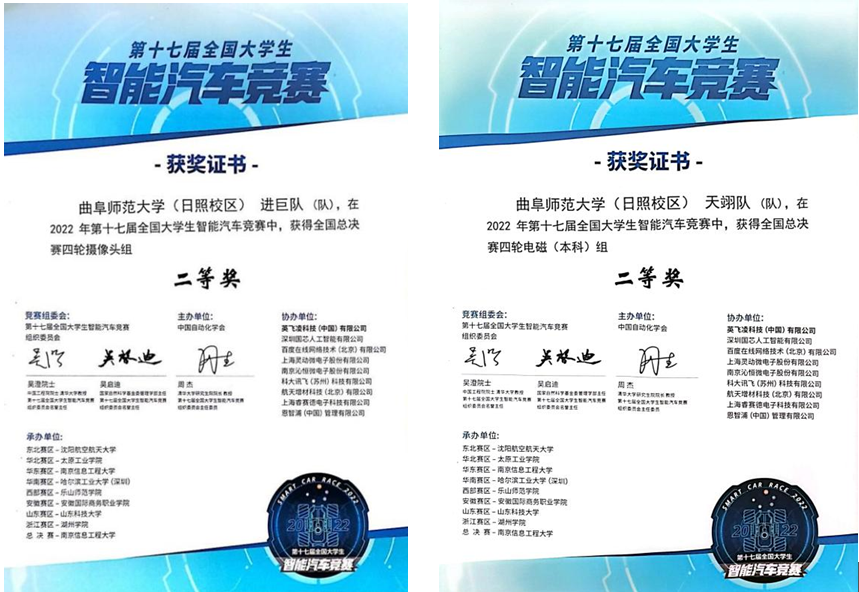 曲阜师大新闻中心讯(通讯员:于运清)近日,第十七届全国大学生智能汽车竞赛决赛成果公布,LD平台_LD(中国)一站式服务官网计算机学院学子在此次比赛中斩获佳绩。在李光顺老师和吴俊华老师的指导下,由贾宝玺、范树玉、孟凯同学组成的进巨队,彭清元、邹如萍、周晓萌同学组成的天翊队入围全国总决赛,并分别荣获摄像头四轮组和电磁四轮组国家级二等奖。