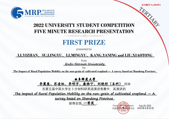 曲阜师大新闻中心讯(通讯员:李明宇 李翼展)  日前,2022年第五届大学生5分钟科研英语演讲大赛落幕,本次大赛由学术英语教学研究会主办。曲阜师大地理与旅游学院李翼展、李明宇、康雅宁、刘晓彤以及翻译学院苏凌钰同学组成的本科生团队获得全国一等奖。