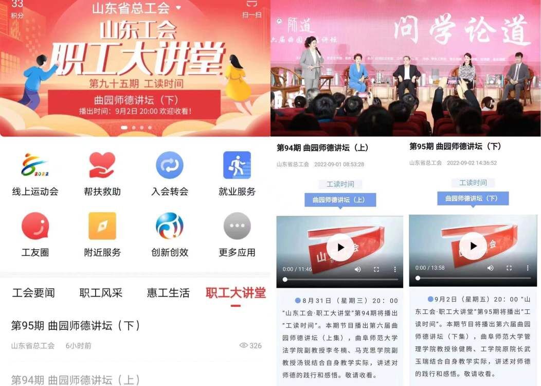 曲阜师大新闻中心讯(通讯员:孙衍) 近日,由曲阜师大工会、党委宣传部、教师工作部联合主办的第六届“曲园师德讲坛”录制视频,被山东省教育工会作为“2022年全省教职工师德建设教育月活动”重要内容推出,于9月1日开始在山东省总工会APP及微信端小程序“齐鲁工惠”——“职工大讲堂”栏目播出(第94、95期于8月31日、9月2日播出),供省内各高校组织教职工观看学习。