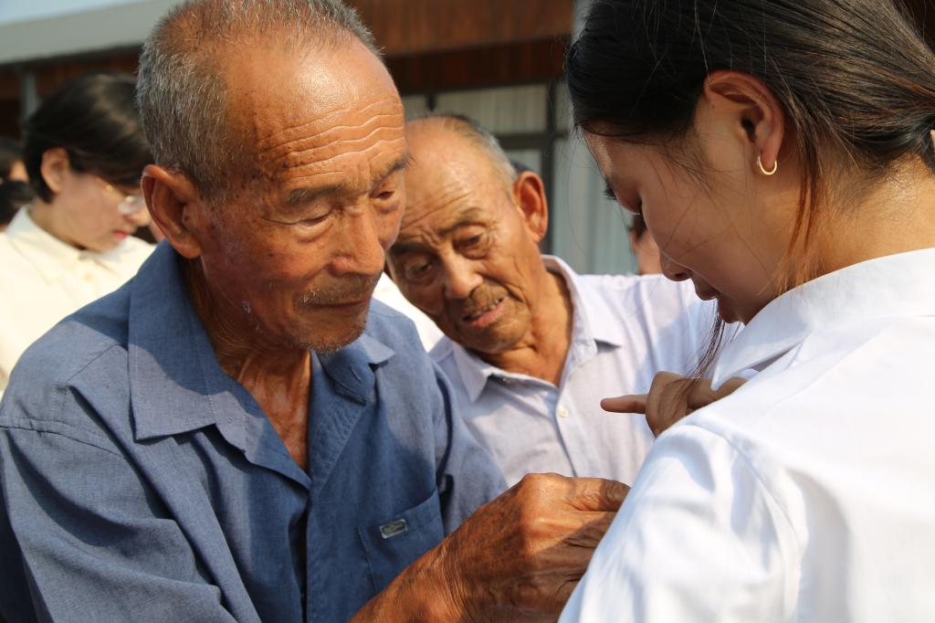 仪式结束后,全体党员来到党旗前,库区老党员在烈日下用颤抖的手,为学生党员佩戴党徽,并深情地叮咛:“听党的话,好好跟党走啊!”佩戴完党徽后,老党员与师生党员共唱《唱支山歌给党听》。随后,党员们重温入党誓词,一起过政治生日,用蓬勃向上的精神风貌,为迎接党的二十大献礼。