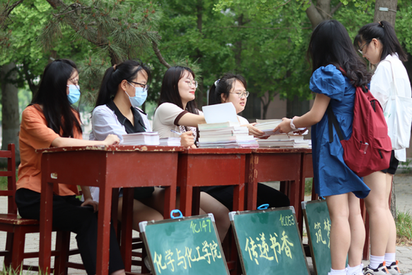 各学院同心协力,积极参与。文学院与历史文化学院在楼前携手开展捐书活动,两院领导作为捐书“代言人”现场宣传,校团委书记孔轶众来到现场嘱托毕业生,希望他们在新征程上做有梦想、做实事的好青年。活动进行时,各学院不断优化举措,合理分配。数学科学学院和化学与化工学院扩大捐书主体,分别面向毕业生和全体本科生群体,于5月22日、6月4日分两批次错时征集书籍,并结合毕业生住宿地点与时间安排,灵活安排收书的时间地点,安排“专人专班”深入宿舍,并提前借好三轮车等运送工具在宿舍楼下等候,把书籍运送到学院,提高了书本的收集率;地理与旅游学院和生命科学学院举办了“传递书香,筑梦曲园”线下捐书仪式,毕业生们将自己的课本传递给师弟师妹,并在活动KT板上签名留念。多种多样的捐书方式增强了毕业生捐书的仪式感和自豪感。