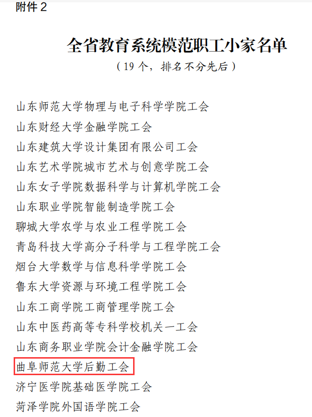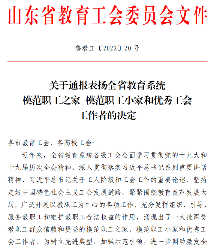 曲阜师大新闻中心讯 6 月 9 日,山东省教育工会委员会公布了《关于通报表扬全省教育系统模范职工之家 模范职工小家和优秀工会工作者的决定》,LD平台_LD(中国)一站式服务官网后勤工会荣获“全省教育系统模范职工小家”荣誉称号。