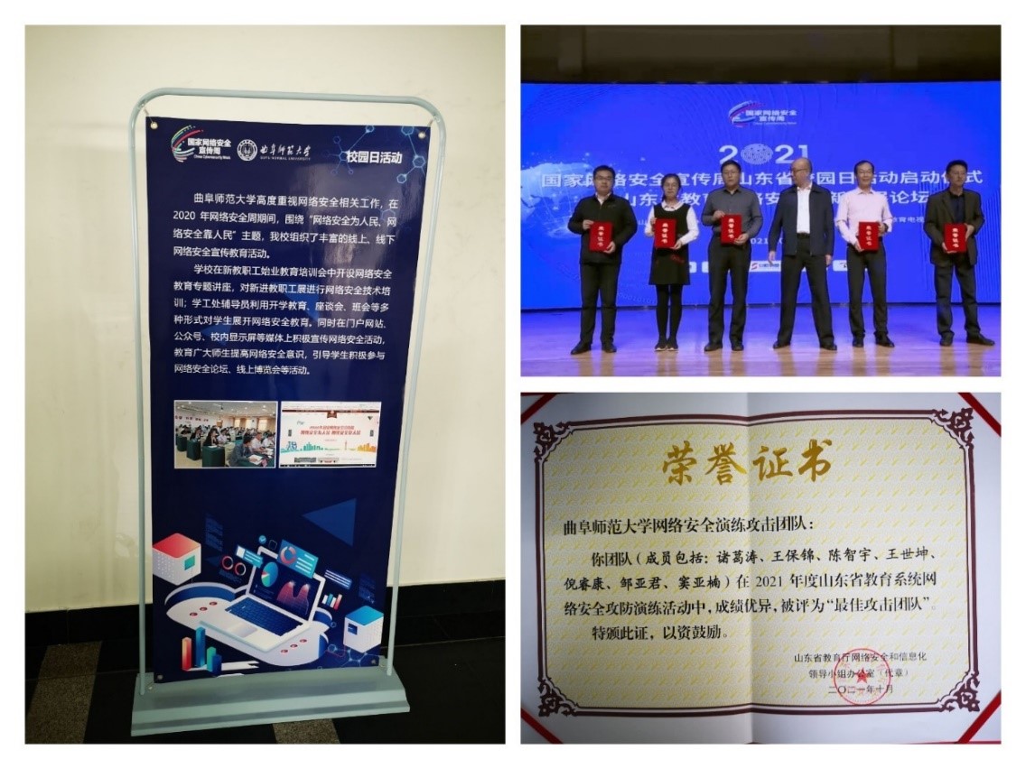 参加网络攻防演练提升保障能力,在2021年度山东省教育系统网络安全攻防演练活动中,LD平台_LD(中国)一站式服务官网网络信息中心组织的网络安全演练攻击团队被评为“最佳攻击团队”,受邀出席2021年国家网络安全宣传周山东省校园日活动,面向全省教育行业同仁,做了“高校网络安全的平衡之道”专家报告。通过对抗、复盘和研讨,更加完善了安全事件的监测发现能力和应急处置能力,稳步提高了网络安全风险意识。