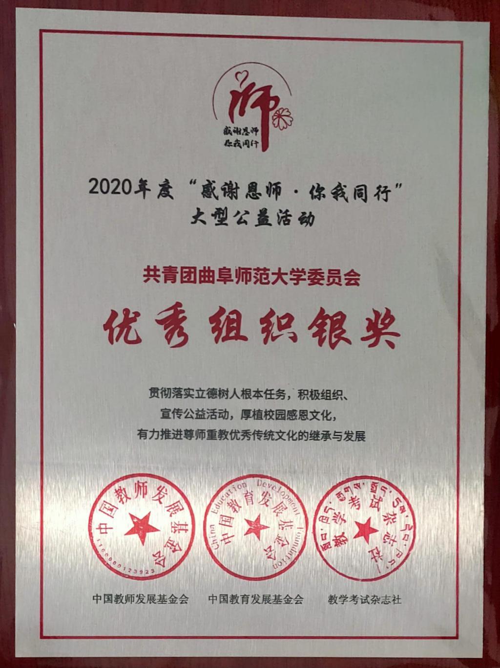 曲阜师大新闻中心讯 在第37个教师节来临之际,由中国教师发展基金会、中国教育发展基金会、教学考试杂志社及中国教育电视台联合举办的2020年度“感谢恩师·你我同行”大型公益活动圆满落下帷幕。我校团委在此次活动中荣获“优秀组织银奖”。