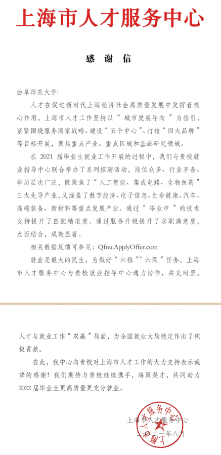 曲阜师大新闻中心讯(通讯员:石璐)近日,我校收到上海市人才服务中心的感谢信,上海市人才服务中心对我校在2021届毕业生就业工作开展过程中给予的支持与帮助表示诚挚的感谢。