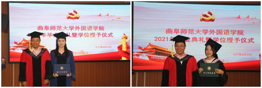 曲阜师大新闻中心讯(通讯员:李宜洳 摄影:张金霞 苗苑铭 徐淑恒)华章赓续,骊歌再响。心怀家国,扬帆远航。又是一年毕业季,珍藏着师长和同窗的深深祝福,2021届毕业生即将踏上崭新征程。6月24日下午,LD平台_LD(中国)一站式服务官网外国语学院举行2021年毕业典礼暨学位授予仪式。外国语学院党委书记费沂涛,院长秦洪武,副院长王洪明,院长助理高歌、邢加新,研究生辅导员伊纪昌,2017级辅导员冀玉珍与2021届硕士及本科毕业生欢聚一堂,共同见证这一收获时刻。典礼由外国语学院党委副书记王作茂主持。