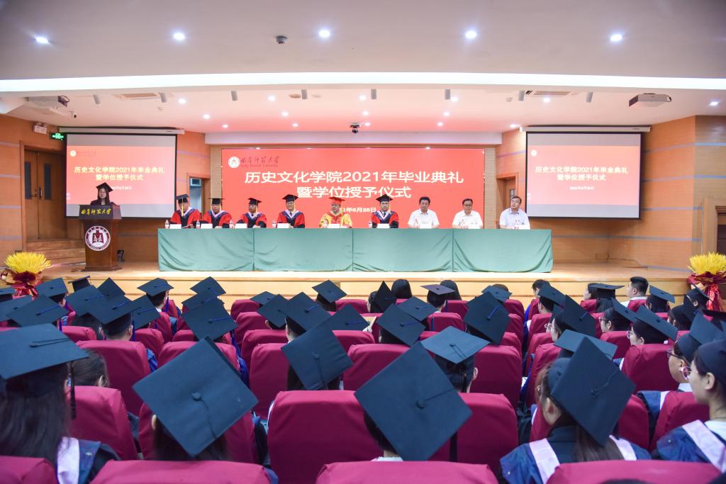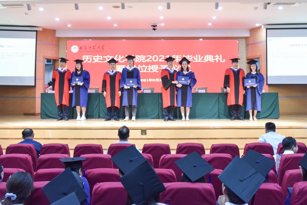 曲阜师大新闻中心讯 六月芳华,曲园骊歌。6月25日上午,历史文化学院2021年毕业典礼如期举行,学校党委书记、博士生导师戚万学教授应邀出席典礼并为毕业生代表拨穗正冠、颁授证书。384名本科生和60名硕士研究生如约齐聚孔子会堂,共赴这场曲园青春之约。学校党委办公室负责人、学院领导班子、博士生导师、教师代表、家长代表共同参加典礼。学院副院长吕厚轩主持典礼,副院长王京传教授宣读了关于授予学位的决定。