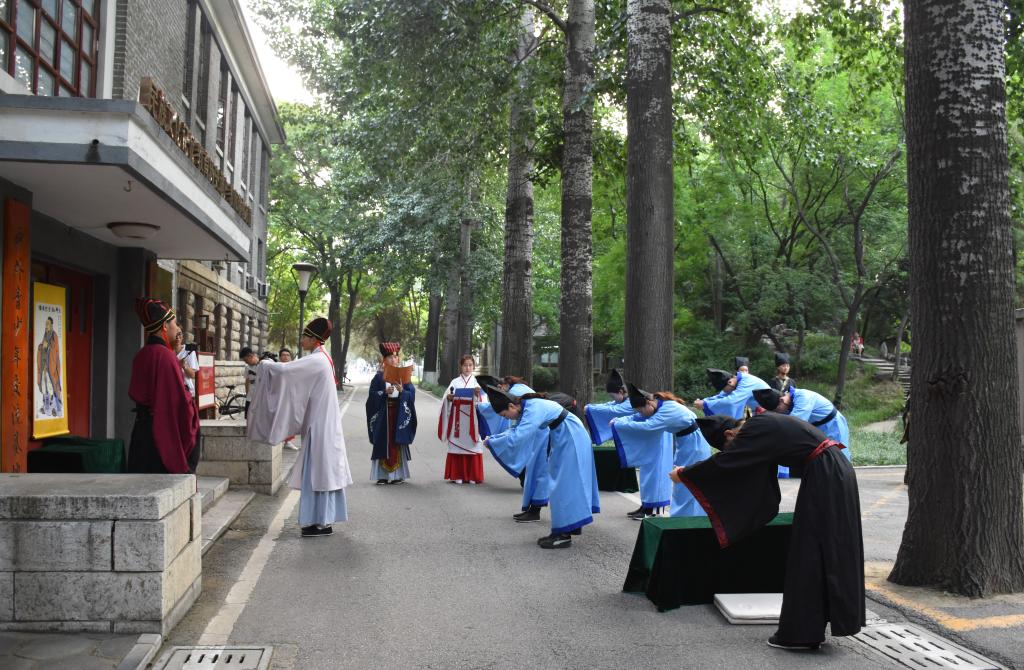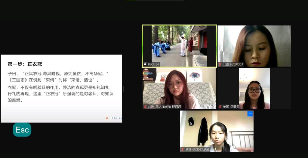 在直播中国云体验课程中,历史文化学院传统礼仪研修中心大学生礼仪队的队员们身着汉服、头戴儒冠,为全球学员献上了一场精彩的“束脩礼”展演。俗语云:“生我者父母,教我者师傅”,该礼仪展演以“尊师重道,明礼求学”为主题,再现了正衣冠、诵读《束脩告文》、献戒、执束脩、训诫、礼敬师儒等场景。观看完毕后,历史文化学院院长成积春教授、指导教师骆明老师还与线上参加直播学习的中外学员进行了实时互动,对学员们提出的问题进行了详细而深刻的解答。