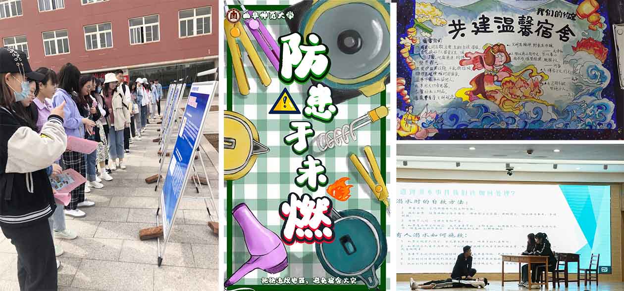 校园安全文化月期间,各学院紧密结合专业、学科特点,积极创新活动形式与内容,通过活动拓展了大学生文明养成教育的形式与内涵,增强了师生的文明意识和综合素养;同时,各学院充分利用网络、报刊、宣传栏、海报、电子屏等,进行线上线下宣传,营造浓厚的校园安全文化教育氛围。各学院选择学生喜闻乐见、易于接受、方便参与的活动方式,有效提高安全教育的知晓率和参与度。传媒学院开展了校园安全微视频比赛,通过一些公益短片向同学们传播安全知识。数学科学学院通过发人深省的标语、口号征集宣传,以达到警示师生、增强师生安全意识的作用。体育科学学院在校园现场布置了防止电信诈骗、用电安全、践踏安全、校园欺凌应对等方面系列展板,宣传如何识破各种骗局,使同学们掌握如何有效保护自身安全,远离伤害,预防自然灾害等日常安全小常识。文学院举行了以“你我牵起手,共筑安全墙”为主题的校园安全知识PPT制作展示活动等,激发同学们对安全的关注度和参与兴趣。管理学院开展了文明宿舍公约征集活动,进一步凝聚共识,建立大家共同遵守的行为规范。