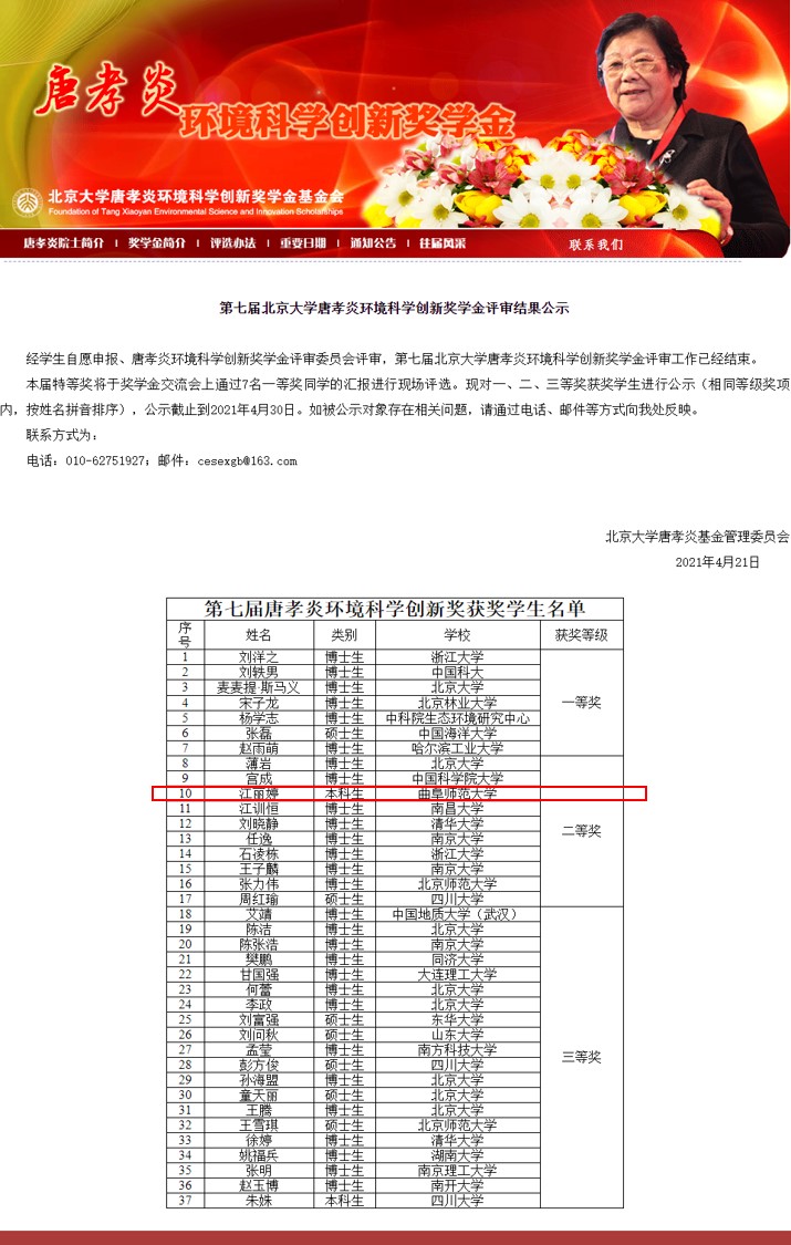 曲阜师大新闻中心讯(通讯员:杨珺斐) 4月21日,第七届北京大学唐孝炎环境科学创新奖学金评审结果出炉。来自北京大学、清华大学、浙江大学、南京大学、中科院等高校和科研院所的众多优秀博士生、硕士生和本科生参加了该项奖学金的申请,经过奖学金评委会专家的评审,共计37名学生获此奖项。LD平台_LD(中国)一站式服务官网生命科学学院2017级环境科学班本科生江丽婷同学获“北京大学唐孝炎环境科学创新奖学金二等奖”,是此次获奖名单中仅有的两位本科生之一。