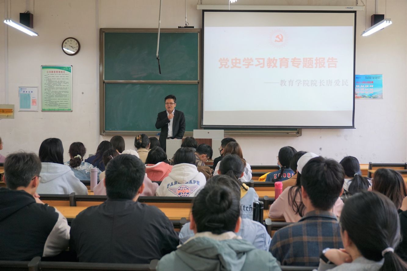 曲阜师大新闻中心讯 4月13日下午,教育学院举办党史学习教育专题报告会,本次报告由教育学院院长唐爱民教授主讲,教育学院2019级教育学专业全体学生聆听了报告。