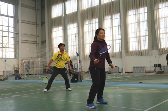 羽毛球赛上,谭丽荣、刘志刚、石峰、刘庆果、荆延德、孙丕苓、周维国老师组成的教工队与学院羽毛球队进行比赛。比赛共分男子双打、女子双打、女子单打、男子单打四个项目。拉吊、扣杀、网前突击,羽毛球在赛场上来回翻飞,参赛选手你来我往,上演一幕幕精彩的对攻好戏。