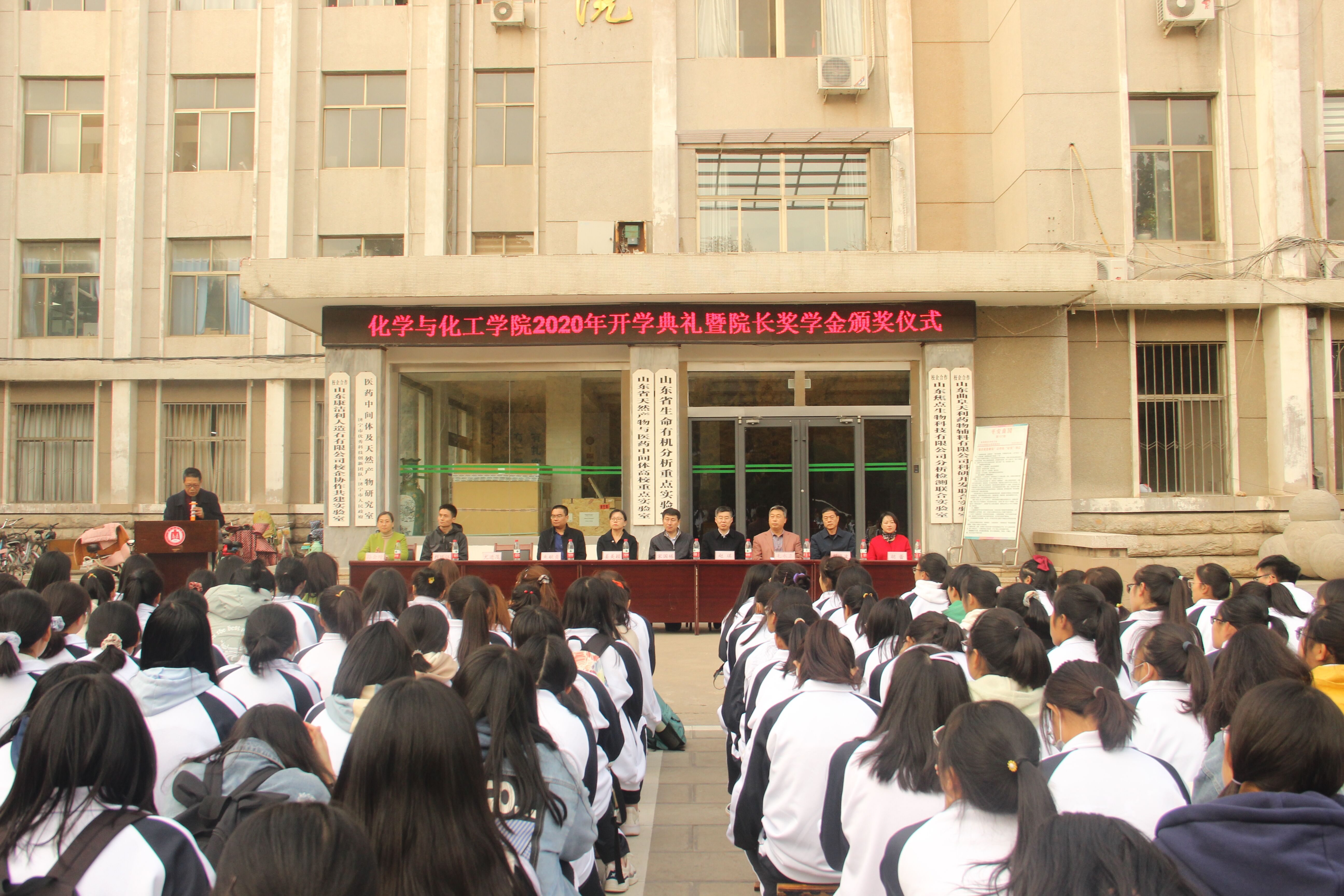 曲阜师大新闻中心讯   11月4日下午,化学与化工学院举行2020年开学典礼暨院长奖学金颁奖仪式。学校学生工作处处长姜美颖、学校团委书记宋国栋、学校教务处副处长朱献贞、学院党委书记赵琪、院长尤进茂、教师代表颜廷江、办公室主任刘海波、团委书记孙金玲、教学秘书胡蕾出席大会。典礼由学院党委副书记毛永正主持。