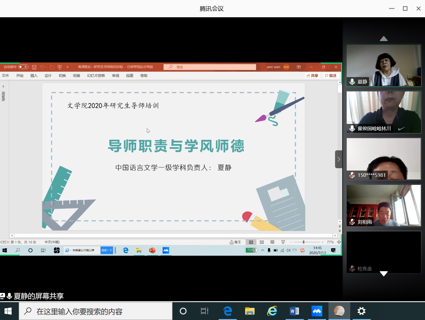 曲阜师大新闻中心讯 为进一步提高研究生导师指导能力、保证研究生培养质量,根据学校决定和要求,713日下午,文学院举办了2020年研究生导师线上培训会,全体研究生导师参加了此次会议。会议由院长助理霍俊国副教授主持。