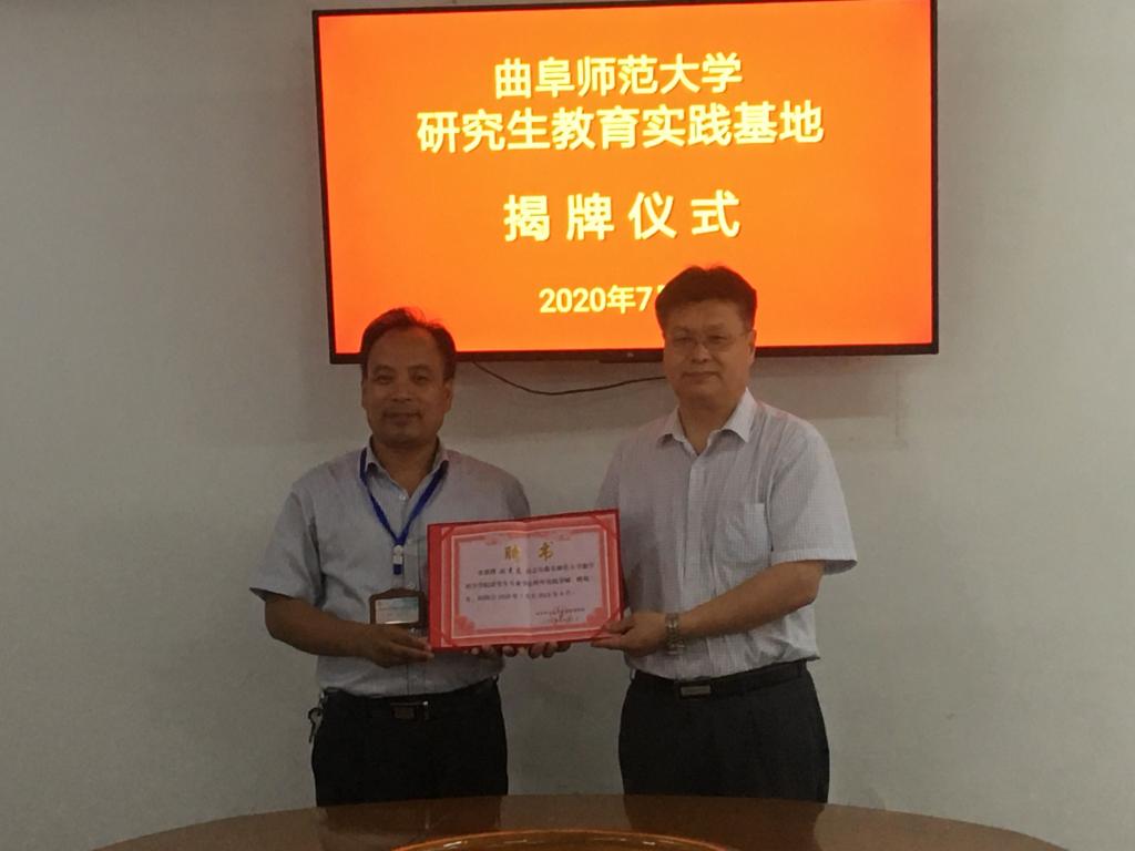 曲阜师大新闻中心讯 7月7日,数学科学学院研究生教育实践基地揭牌仪式在曲阜市杏坛中学举行。杏坛中学校长胡滨及杏坛中学受聘任的研究生指导教师,数学科学学院党委书记刘建新,副院长郑召文,数学研究所副所长王培合,研究生辅导员胡东坡参加了活动。仪式上,胡滨、刘建新共同为研究生教育实践基地揭牌,刘建新为研究生专业学位校外实践导师颁发了聘书。