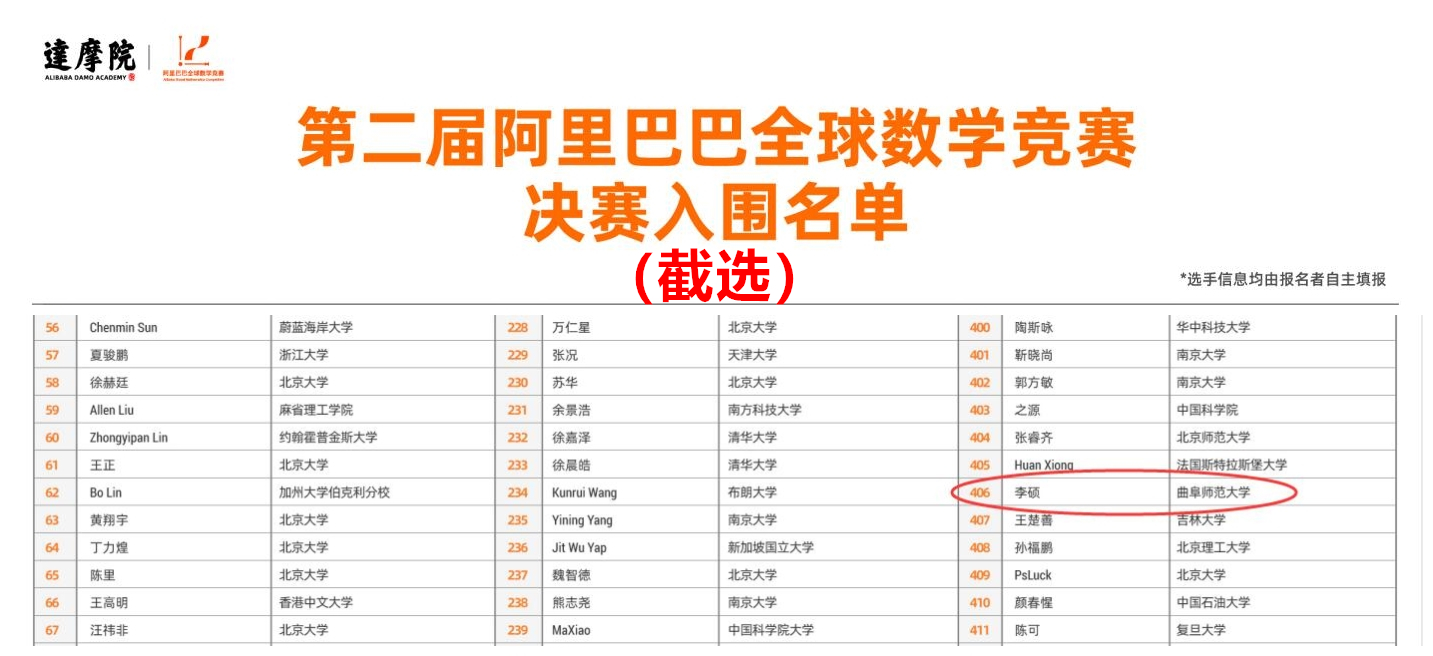 曲阜师大新闻中心讯(通讯员:胡东坡)4月9日,阿里巴巴达摩院在其官方网站上公布了第二届阿里巴巴全球数学竞赛总决赛名单,数学科学学院2019级研究生李硕同学成功进入决赛。